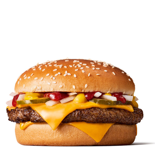 The classic McDouble burger stacks two 100% pure beef patties seasoned with just a pinch of salt and pepper. Wondering what the difference is between a McDouble and a Double Cheeseburger? A slice of cheese! What comes on a McDouble? Well, it’s topped with tangy pickles, chopped onions, ketchup, mustard and a melty slice of American cheese. There are 400 calories in a McDouble. The McDouble contains no artificial flavors, preservatives or added colors from artificial sources.* Our pickle contains an artificial preservative, so skip it if you like.