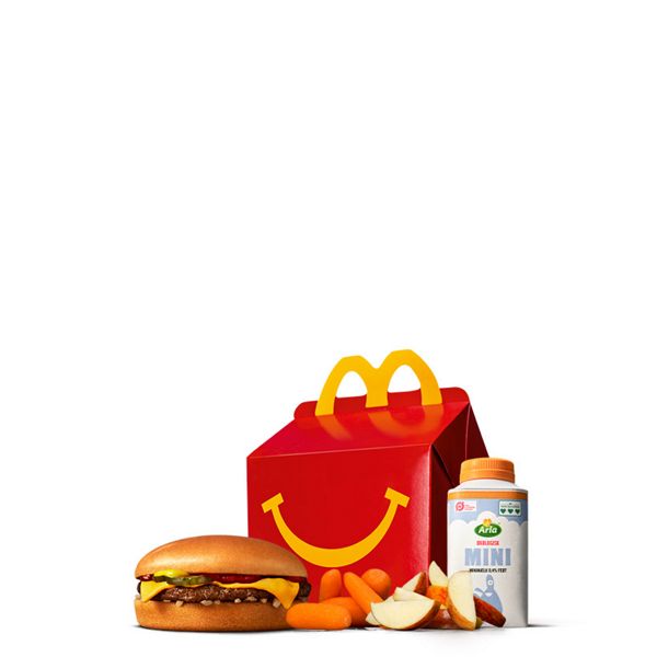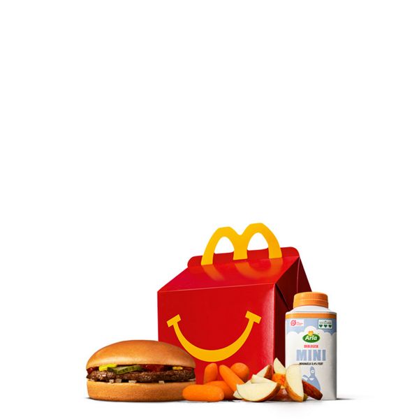 Happy Meal® med 4 stk. Veggie Nuggets. Fås med enten gulerødder eller æbler. Som drikkevare kan der vælges Arla® Økologisk minimælk, juice, kildevand eller lille sodavand. Som tilbehør vælges mellem lille pommes frites eller gulerødder. Med et Happy Meal® medfølger der altid en bog eller et stykke legetøj.
