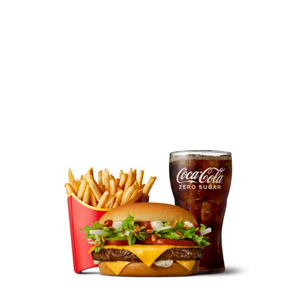 Når du craver McD … Så prøv vores nye Homestyle Cheesy Ranch Veggie, der består af en krydret soya-bøf trøffelsauce, smelteost med hvid cheddar, pickles, grillede løg og ristede løg i en burgerbolle. Som tilbehør kommer pommes frites og en kold drik.