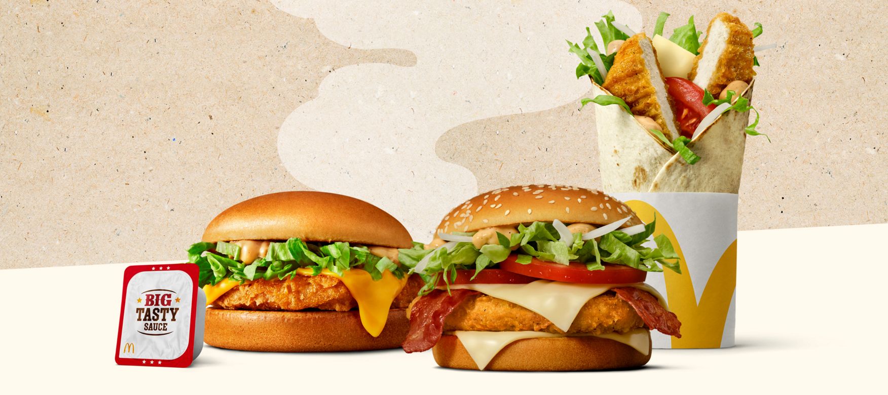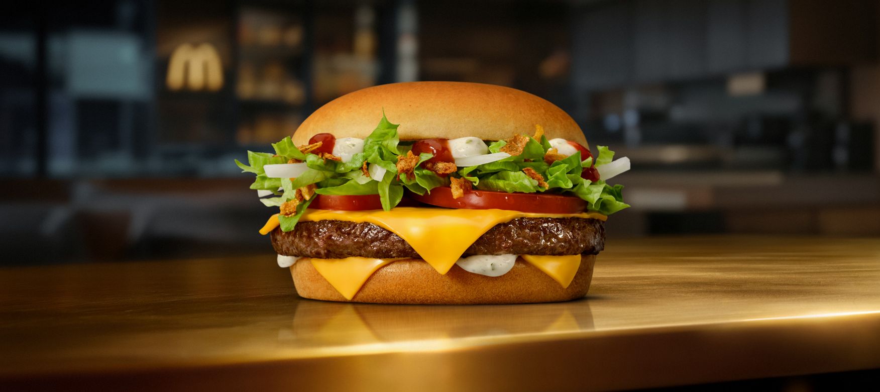 Når du craver McD … Så prøv vores nye Homestyle Cheesy Ranch, der består af en oksekødsbøf, ranch sauce, smelteost med cheddar, tomater, salat, løg, ristede løg og salsa sauce i en burgerbolle.