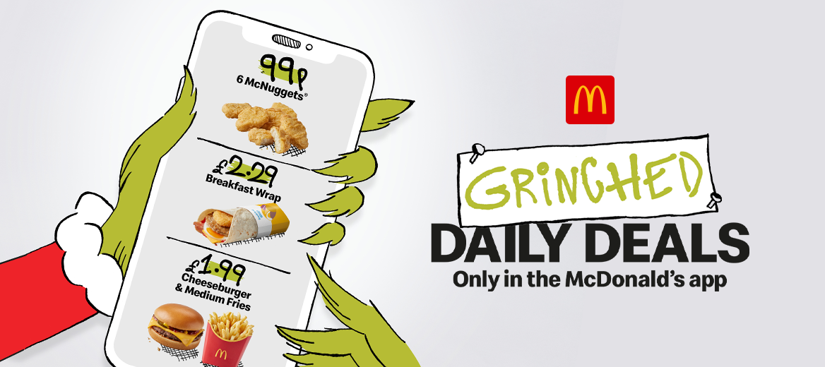 18+. Daily offers in-app until 23:59 24/12. Redeem from 'Offers' section of app. One-time use per offer per day. Participation varies. Fees apply to delivery. Serving times apply. Subject to availability. Cannot be used with any other offer or promotion. See mc-ds.uk/grincheddeals for full T&Cs. App T&Cs and Privacy Statement apply. TM & 2025 © Dr. Seuss Enterprises. © 2025 McDonald’s.