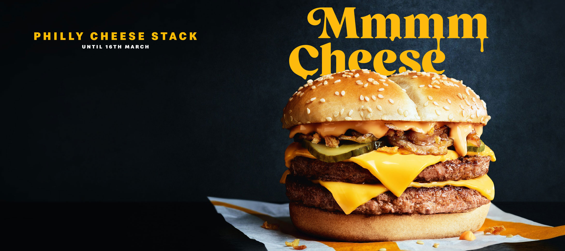 Two succulent beef patties with a cheddar cheese sauce, a cheese slice, grilled and crispy onions and pickles served in a toasted bun. Did we mention it's really cheesy?