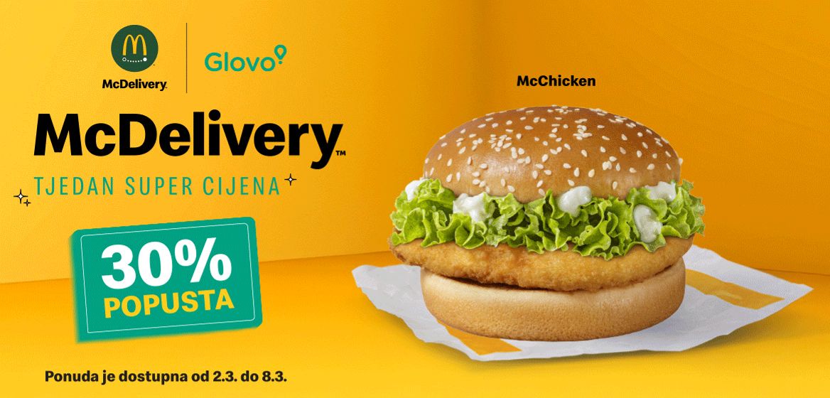 Od 2. 3. do 8. 3. na Glovu možeš naručiti kombinaciju 20 komada Chicken McNuggetsa i tri umaka ili McChicken uz 30 % popusta.