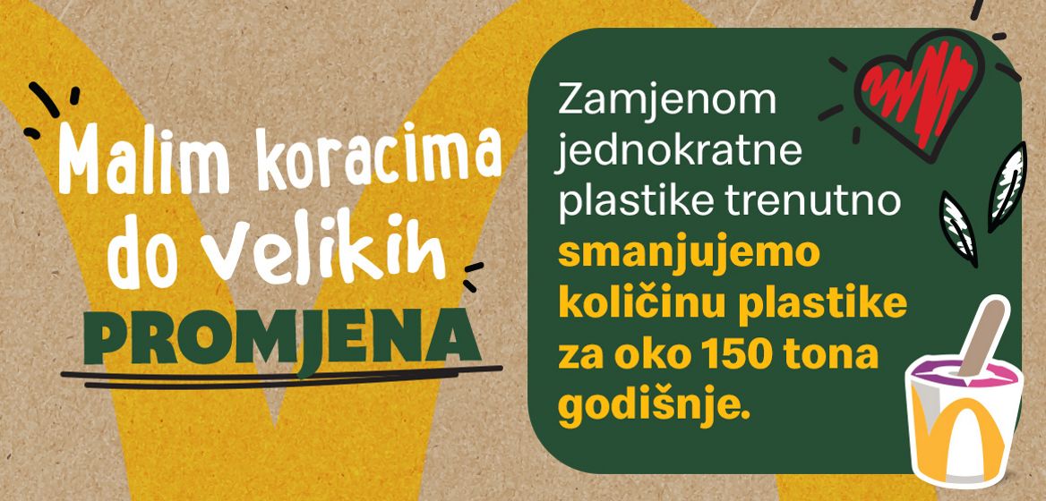 Plastiku smo započeli mijenjati boljom alternativom još 2019. godine, kada smo plastične slamke i pribor za jelo, te poklopce za McFlurry zamijenili papirnatim materijalima i drvenim priborom, a do kraja 2025. godine planiramo plastiku maksimalno smanjiti ili ju potpuno eliminirati.