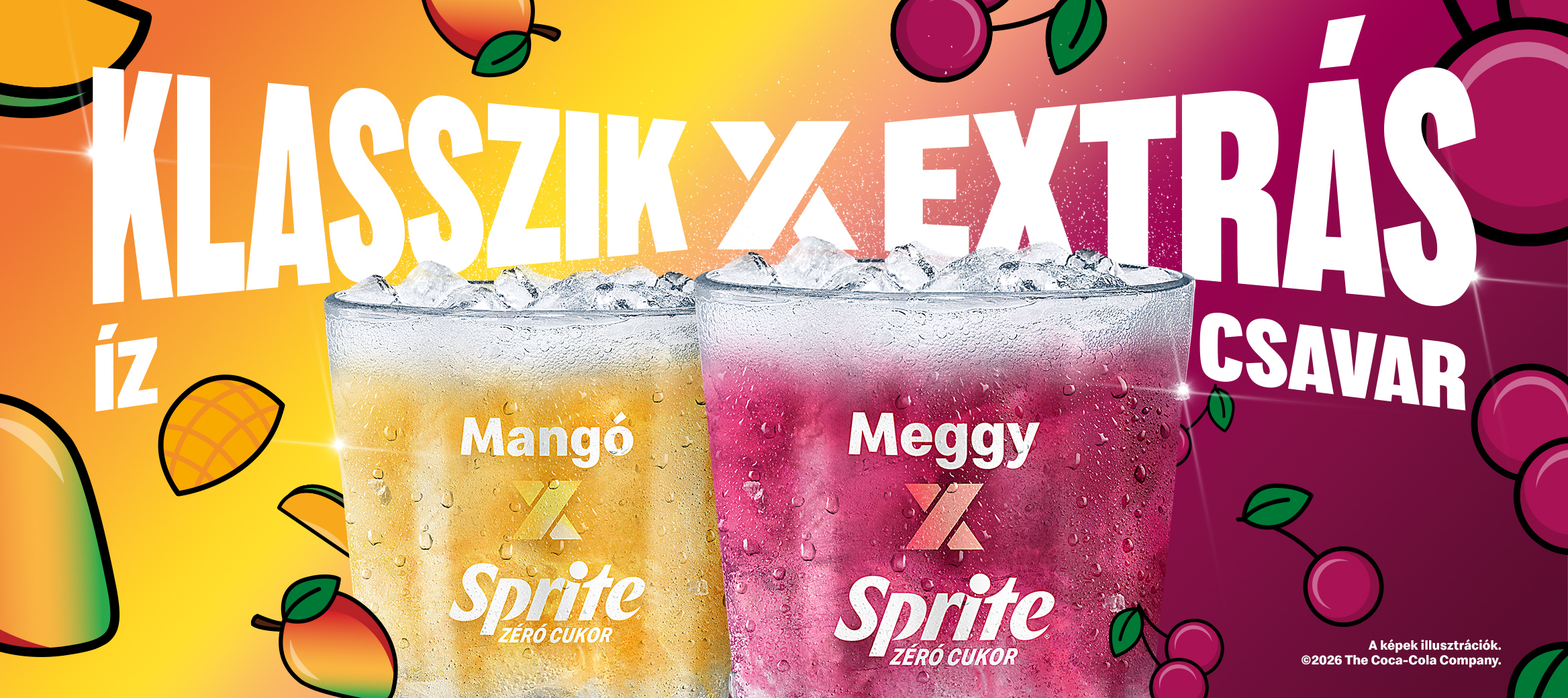 *Az időszakos termékek 2026.04.15-től visszavonásig, illetve a készlet erejéig érhetőek el. A Mangó x Sprite® Zero termék mangós szirupot, a Meggy x Sprite® Zero termék meggyes szirupot tartalmaz. A képek illusztrációk. ©2026 The Coca-Cola Company