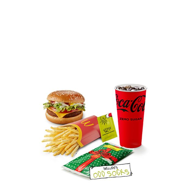 A vegan McPlant® burger served with your choice of Grinched McShaker Fries, Side Salad or Veg/Fruit Bag, plus a pair of The Grinch socks and your choice of drink.