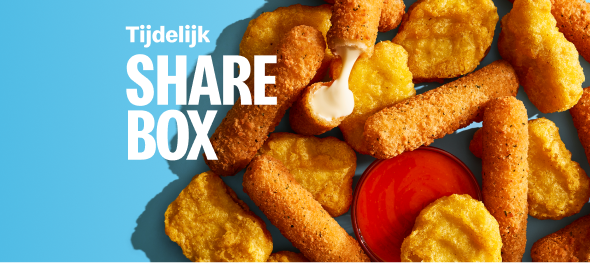 Daar is ‘ie weer! De Sharebox, nu met 10 Spicy of normale Chicken McNuggets en 10 Mozzarella sticks. Dippen maar!