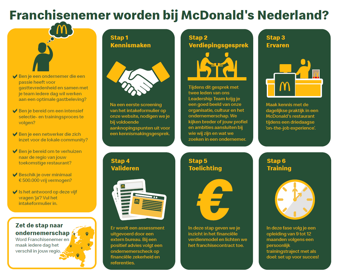 De komende jaren zoekt McDonald’s nieuwe Franchisenemers. Ondernemers met passie voor lokaal ondernemerschap die het McDonald’s merk in Nederland nog sterker willen maken. Als Franchisenemer ben je zelf verantwoordelijk voor jouw eigen succes, maar natuurlijk biedt McDonald’s jou de ondersteuning die nodig is om van jouw bedrijf een succes te maken.