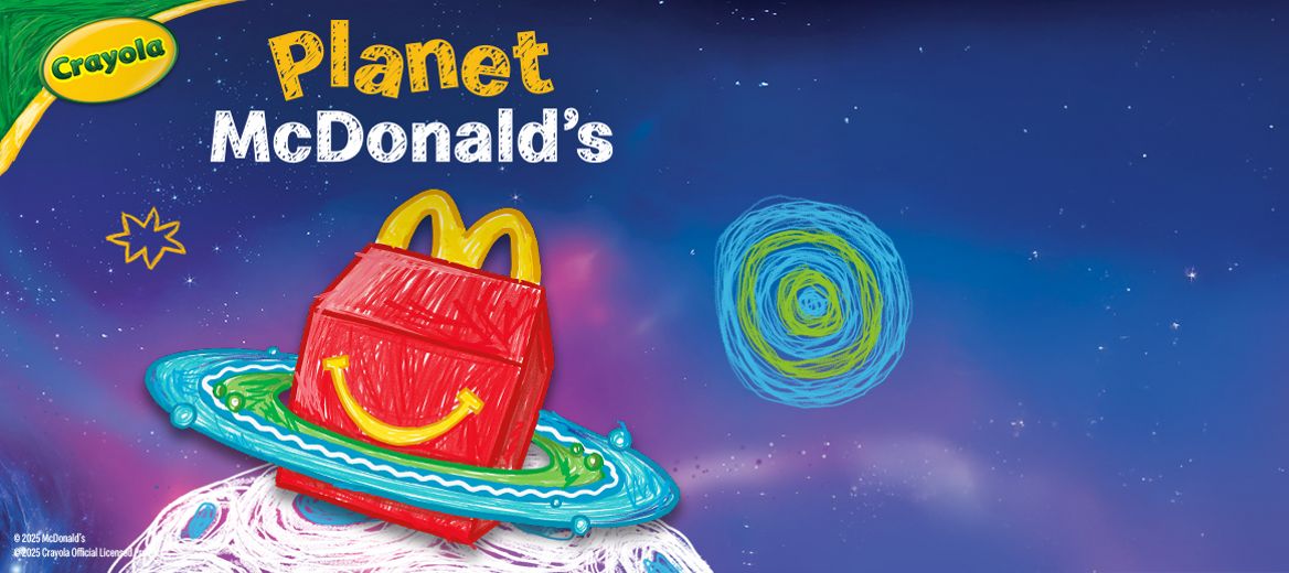 من السفن الفضائية والكواكب إلى مجرات بأكملها، أطلق لإبداعك العنان وحلّق بين النجوم! ولوّن عالمك مع كرايولا، الآن مع كل وجبة هابي ميل.