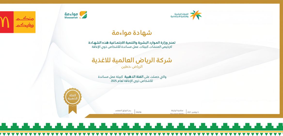 ماكدونالدز السعودية المطعم الوحيد الذي يحصل على شهادة المواءمة - الفئة الذهبية لعام 2025