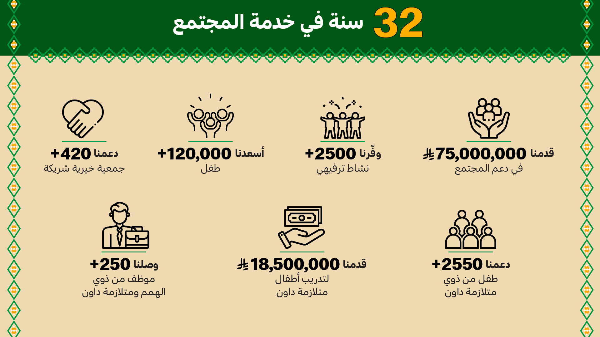 المسؤولية الاجتماعية تجاه أهلنا وأبناء وبنات وطننا كانت ولا زالت على رأس أولوياتنا منذ اليوم الأول. وقد حرصنا منذ انطلاقتنا وافتتاح اول فرع لنا قبل 32 عاما على أن نترك بصمة واضحة في دعم المجتمع، حيث أطلقنا مئات المبادرات في العمل الإنساني والمجتمعي والمشاركة في عشرات الحملات الوطنية والإنسانية المجتمعية بالتعاون مع مختلف الجهات في الوطن، التي أحدثت أثرًا إيجابيًا ملموسًا في حياة أهلنا من أبناء الوطن، هذا إلى جانب تركيزنا منذ عدة سنوات وبشكل أساسي على دعم فئة ذوي متلازمة داون الغالية على قلوبنا جميعا من خلال توظيفهم وبناء قدراتهم وترفيههم إضافة لإقامة حملات خيرية لدعمهم.
