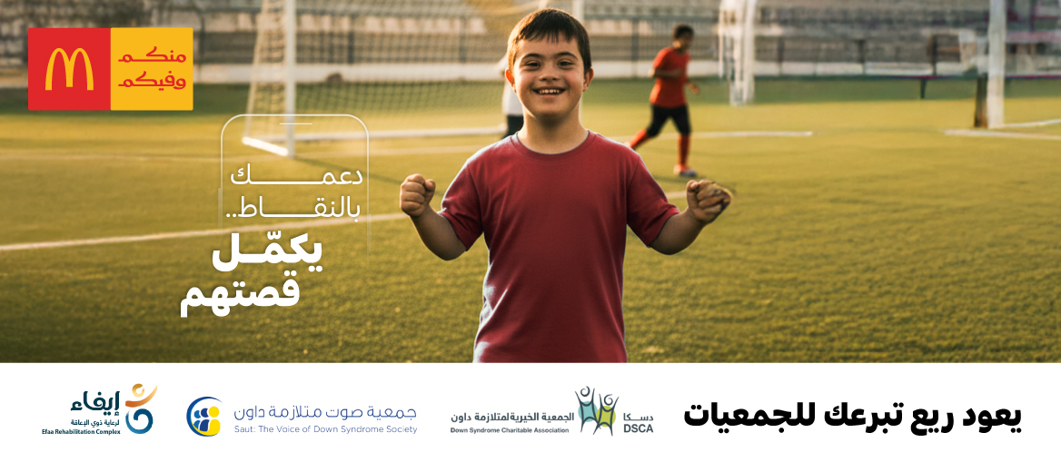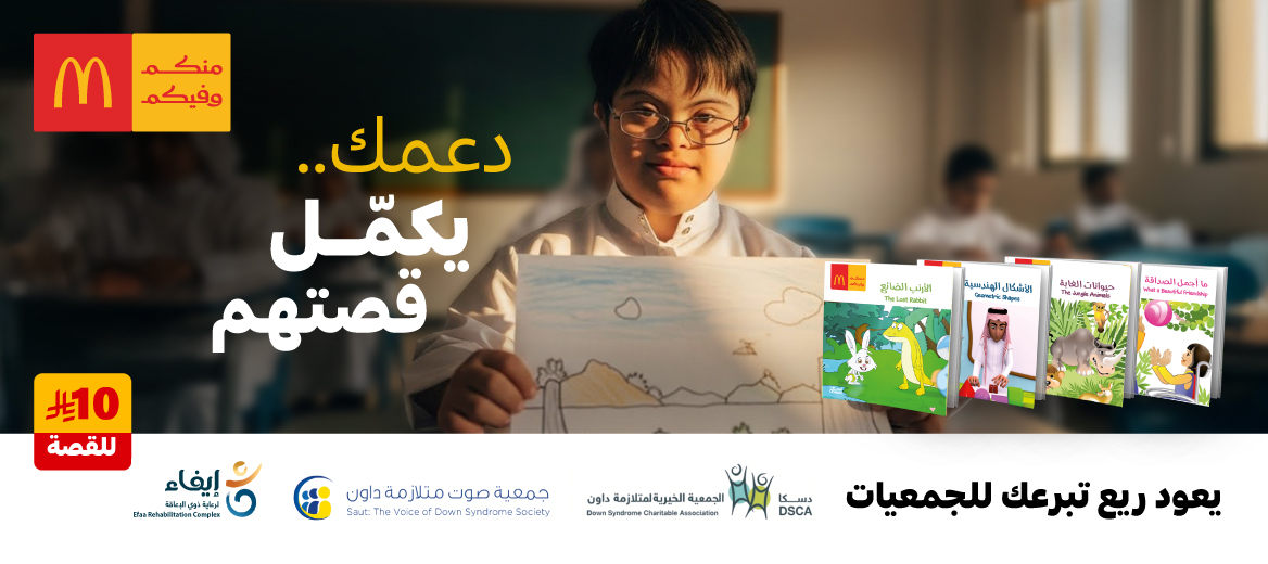 لدعم ذوي متلازمة داون في المملكة العربية السعودية، تعود حملة رمضان الخيرية السنوية 2026، حاملة معها رسالة إنسانية تُجسد معنى العطاء في هذا الشهر الفضيل، حيث تُعنى الحملة ببيع القصص التربوية والتوعوية للأطفال في فروعنا خلال شهر رمضان المبارك، وتهدف هذه القصص إلى غرس قيم التقبّل والاحترام والدعم منذ الصغر، ويُخصص ريع بيع هذه القصص لدعم ثلاث جمعيات خيرية متخصصة، لكل منها دور فاعل في تمكين ذوي متلازمة داون ودعم أسرهم، ويشمل الدعم: جمعية دسكا الخيرية عبر برنامجي ماكدونالدز لرفع الكفاءة اللغوية وبرنامج ماكدونالدز لرفع الكفاءة الوظيفية بمجمل 60 طفل مستفيد، وجمعية صوت متلازمة داون من خلال برنامجي صوت لمساعدة الذات وبرنامج صوت للقراءة والكتابة، بعدد 143 طفل مستفيد، إضافة إلى جمعية إيفاء الخيرية عبر برنامجي مدارك ومهارة ليستفيد منها 59 طفل، على أن تُنفذ هذه البرامج خلال الفترة من سبتمبر 2026 وحتى يونيو 2027.