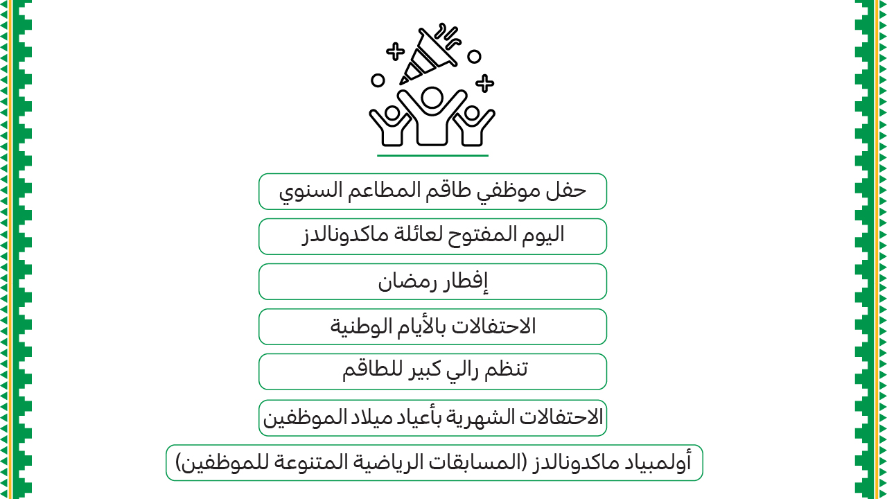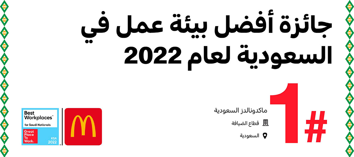 تضع ماكدونالدز السعودية موظفيها في صميم أولوياتها، انطلاقًا من قناعتها بأن النجاح يبدأ من الداخل، لذلك تعمل الشركة على توفير بيئة عمل إيجابية تُعزز روح الفريق وتقدّر مساهمات كل فرد، مع الالتزام بأعلى معايير الموارد البشرية، ومن خلال برامجها المتنوعة، تسعى الشركة إلى دعم التطور المهني لموظفيها، وتهيئة أجواء عمل يسودها التعاون والمرح، بما ينعكس إيجابًا على أدائهم وإبداعهم، كما تفخر ماكدونالدز السعودية بما تتبناه من ممارسات تعكس احترام الموظفين وتقديرهم، وتضمن لهم بيئة عمل صحية ومحفزة على المدى الطويل، وتقديرًا لهذا النهج، حصلت ماكدونالدز السعودية مرات عديدة على جائزة أفضل بيئة عمل في ألسعودية والشرق الأوسط.