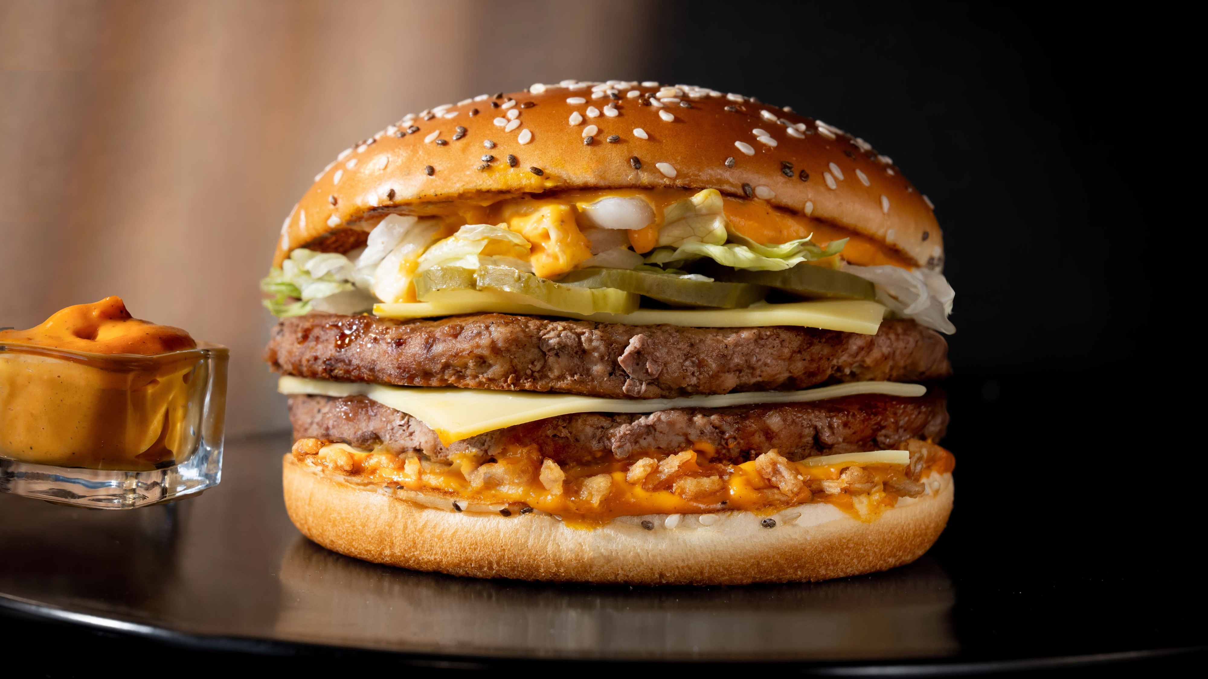 不只份量十足,更是美味十足!「Big Arch霸牛堡」以獨特芝麻奇亞籽麵包,嚴選厚實多汁、牛香四溢的雙層重磅四盎司安格斯牛肉,搭配三片奶香濃郁的的白切達吉事、新鮮爽脆生菜與酸黃瓜,再加上金黃酥脆的炸洋蔥與新鮮洋蔥絲,帶來多重層次的驚喜口感,最後淋上獨家Big Arch霸牛醬汁,絲滑濃郁,融合奶油、黃芥末與酸黃瓜的香氣,酸甜交織,完美襯托出牛肉的風味。