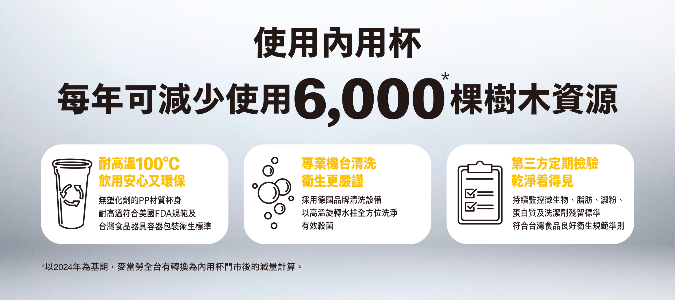 拿起內用杯,這樣也可以做環保!到麥當勞用餐使用內用杯,每年可減少使用6,000*棵樹木資源! *以2024年為基期,麥當勞全台有轉換為內用杯門市後的減量計算。