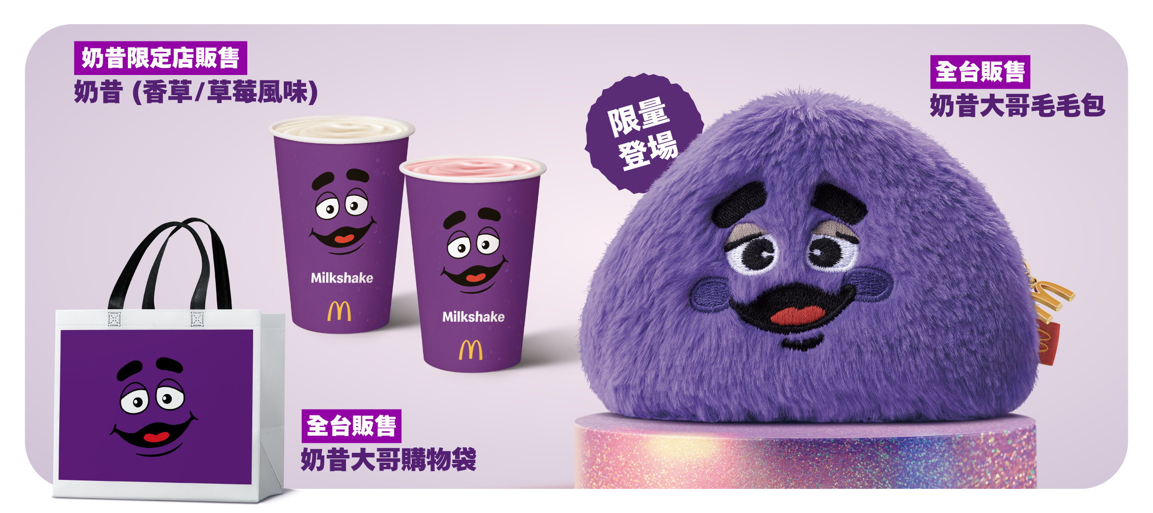 想要入手軟Q呆萌的奶昔大哥毛毛包嗎?快到最近的麥當勞餐廳,把奶昔大哥帶在身邊!