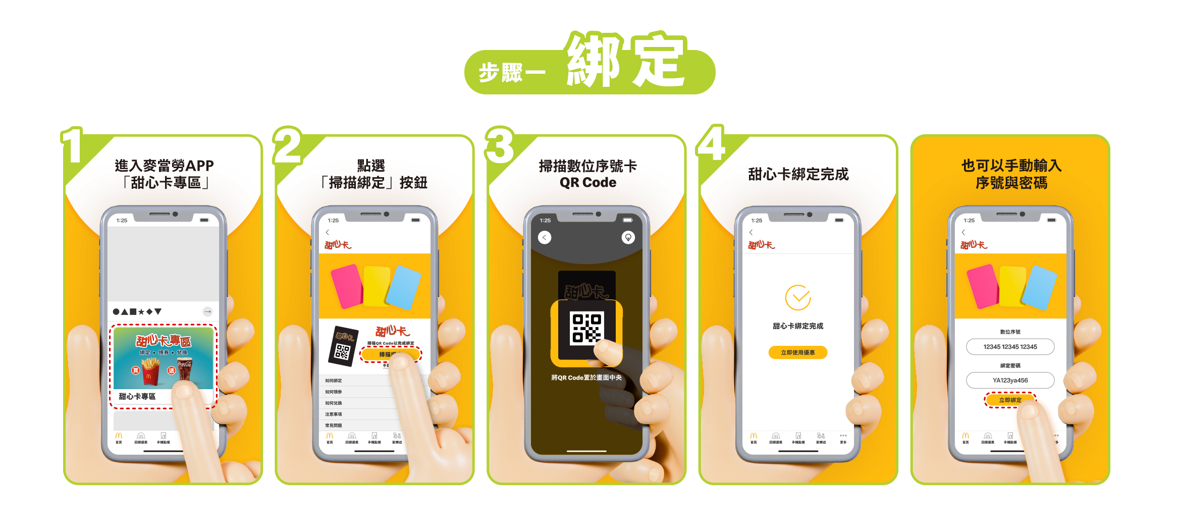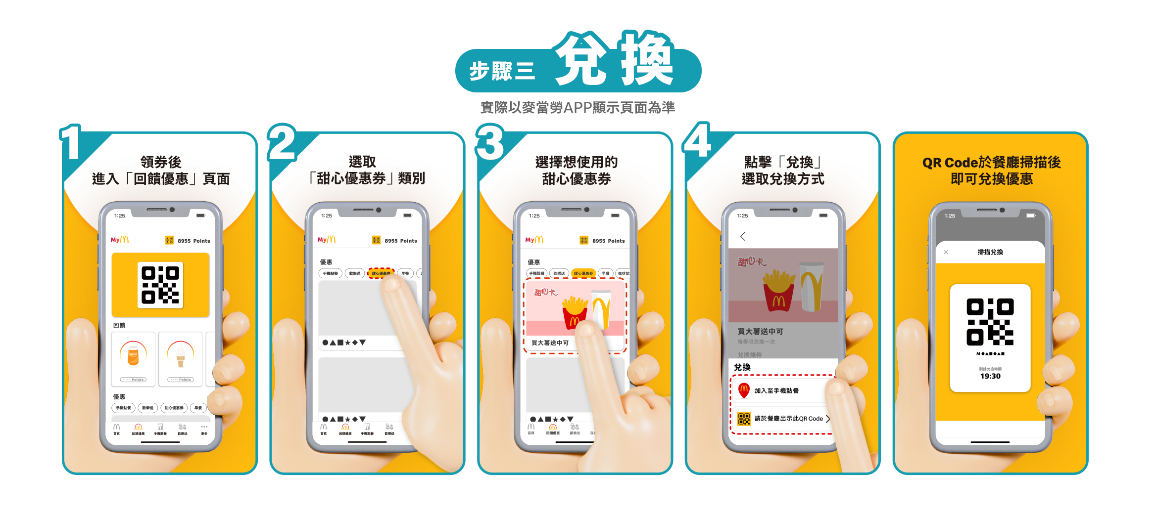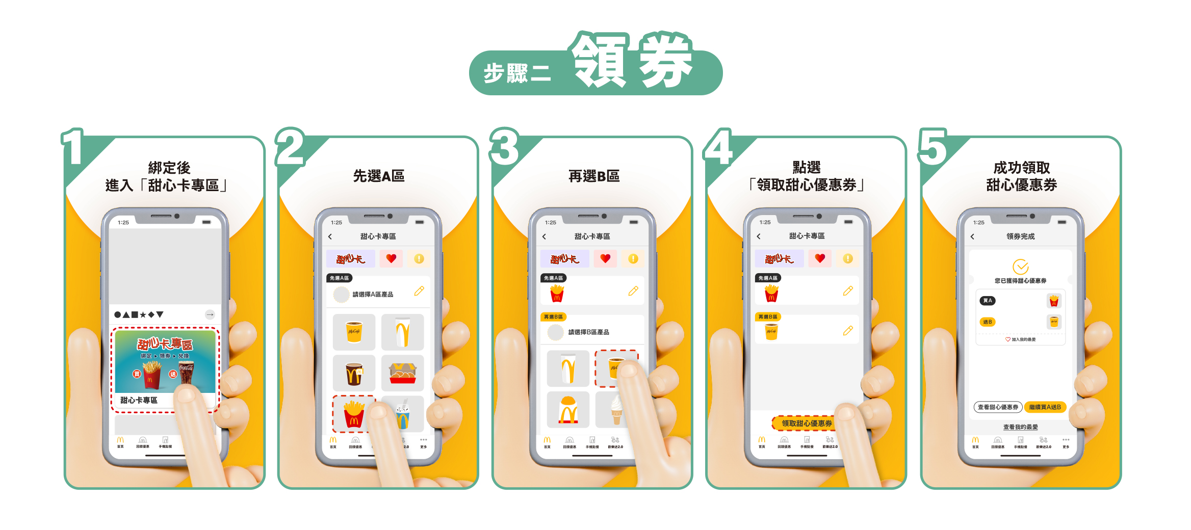 於指定期間完成綁定,於麥當勞APP中點擊「回饋優惠-甜心優惠券」,即可兌換2大數位限定禮