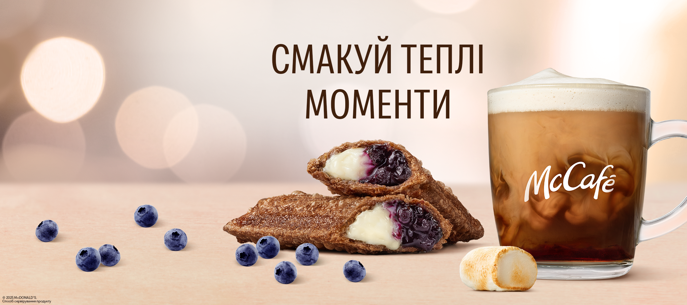Хрумкий свіжоспечений пиріг із чорницею та кремом і ніжне лате із сиропом зі смаком підсмаженого маршмелоу створені для теплих моментів. Смакуймо їх разом у МакДональдз!