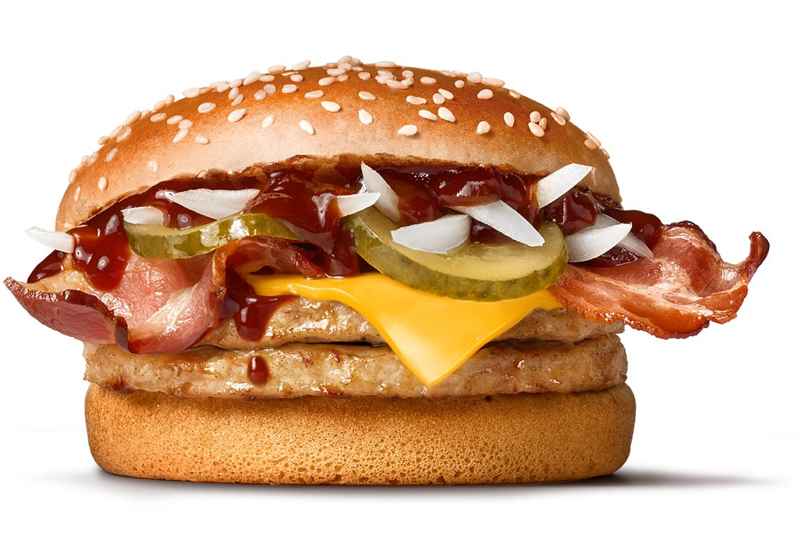 Вестерн Барбекю — це соковите поєднання двох апетитних котлет зі свинини з ароматним беконом, слайсом ніжного сиру чедер, двома маринованими огірочками, свіжою цибулею та новим пікантним соусом із солодкувато-димним смаком у мʼякій булочці.