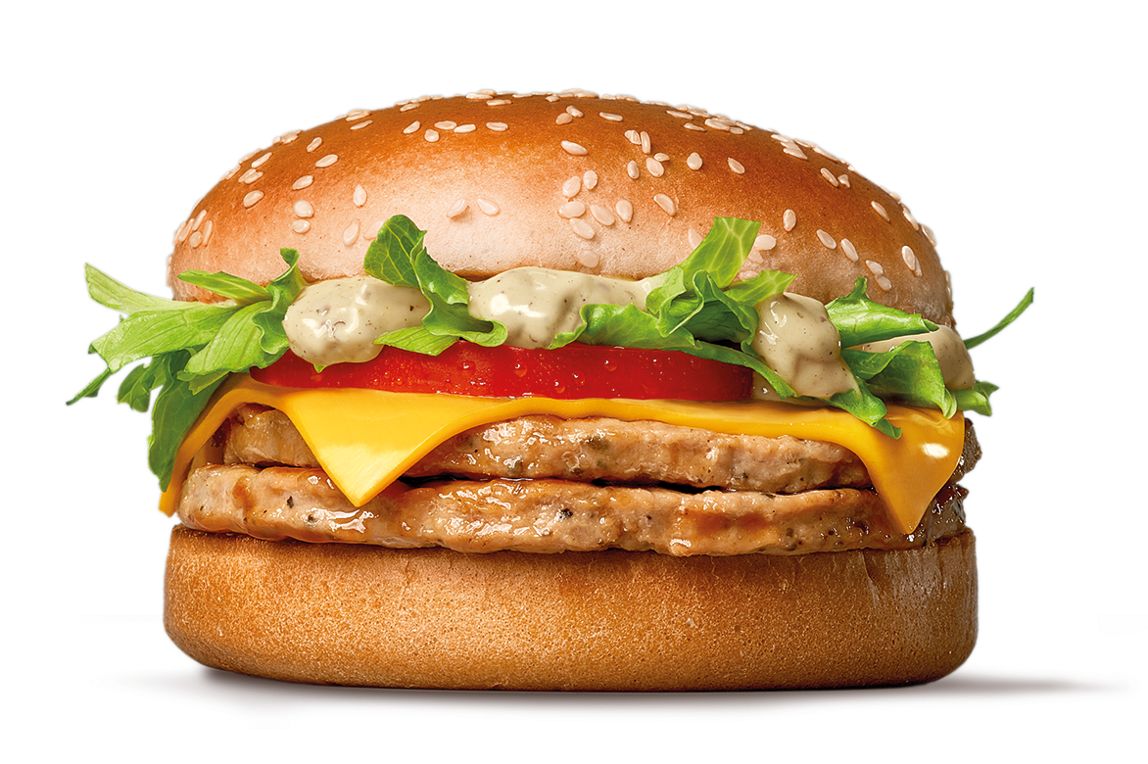 Мʼяка булочка, дві апетитні котлети зі свинини, слайс ніжного сиру чедер, свіжий помідорчик і салат — і все це заправлено новим особливим соусом.